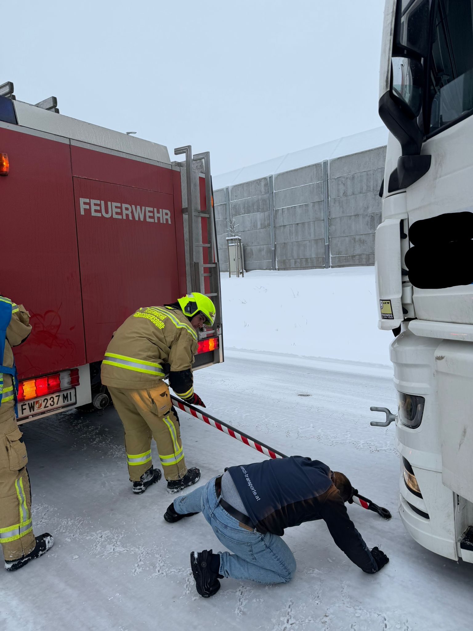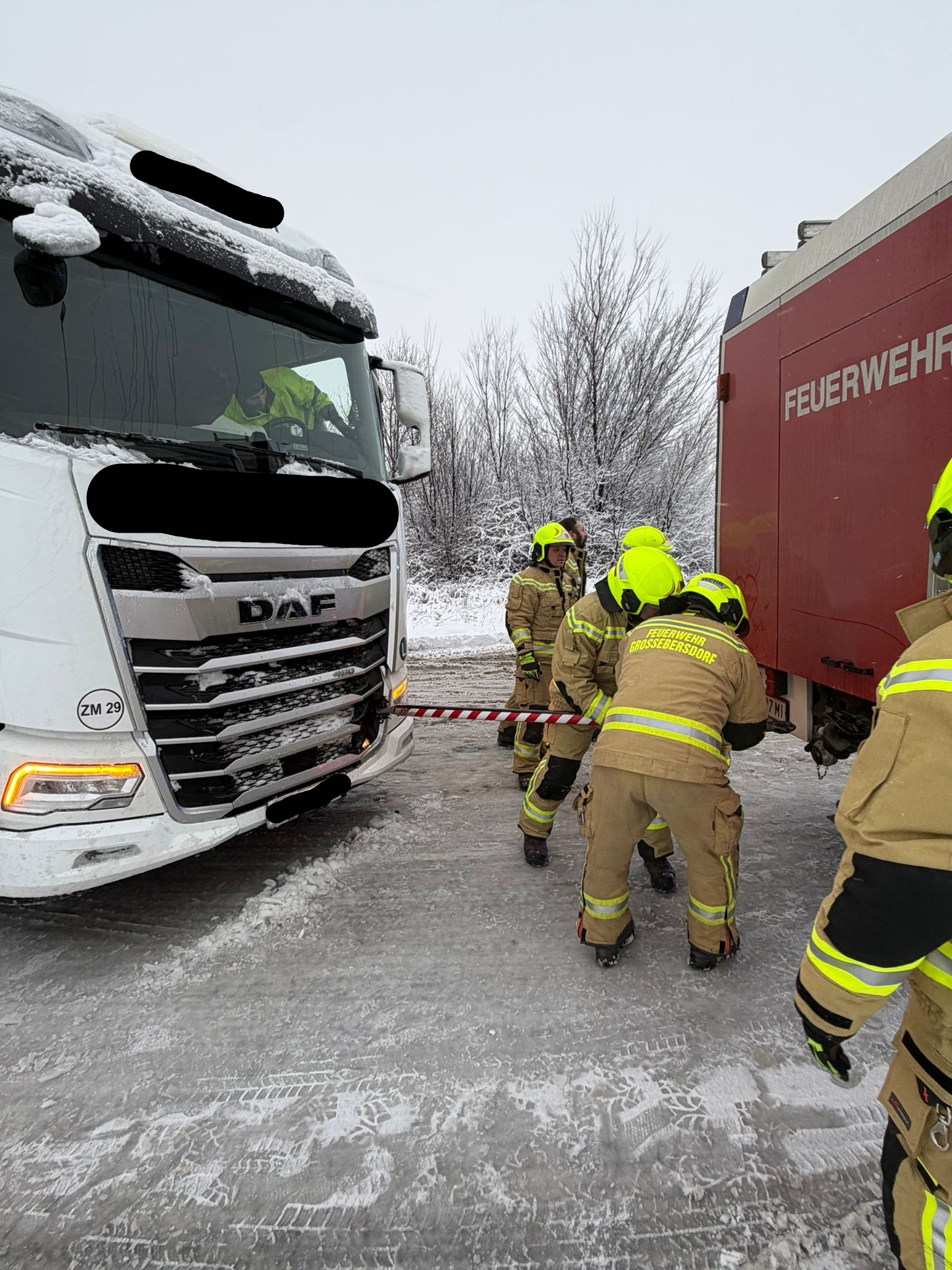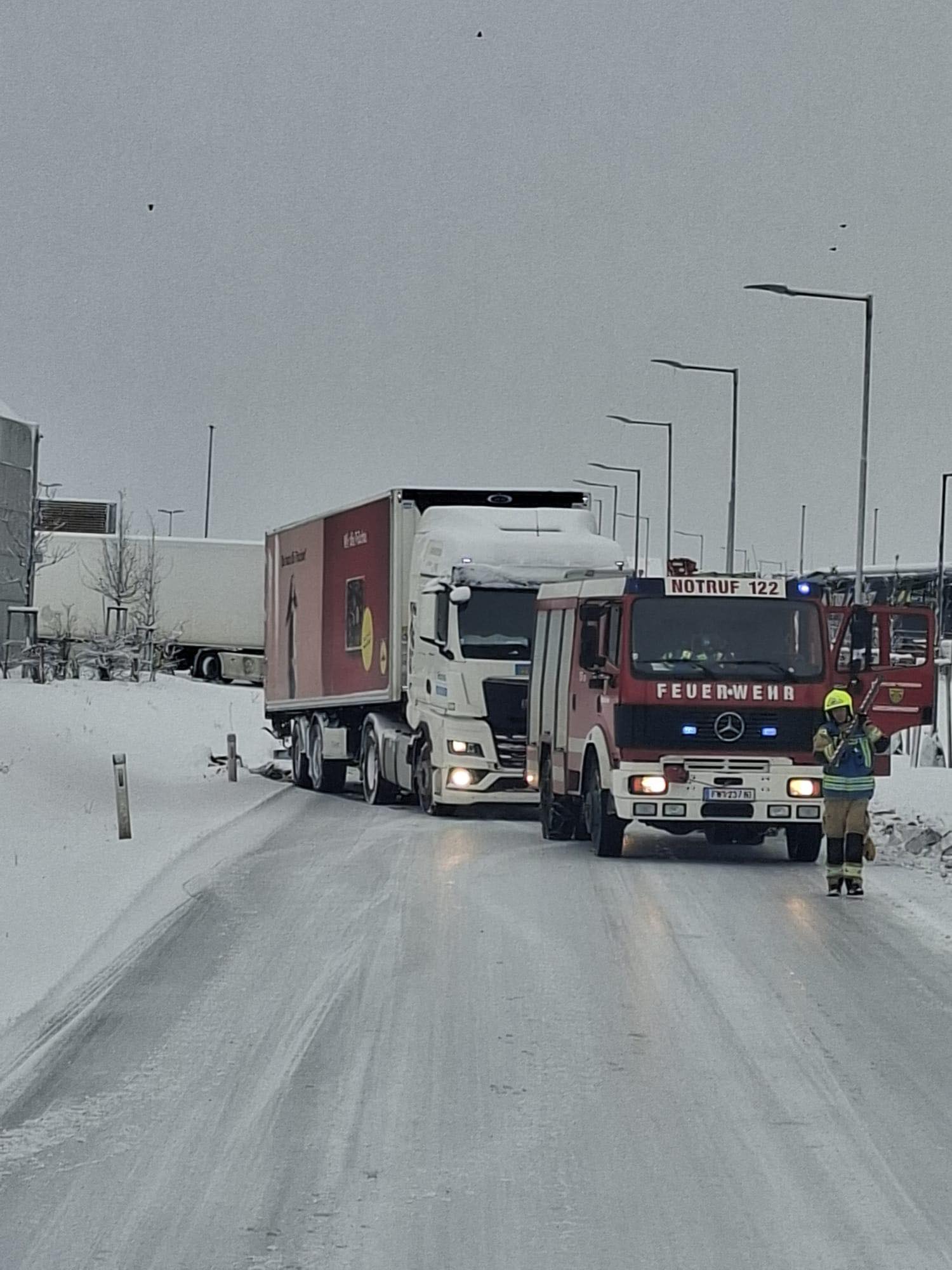 Am 20.02.2026 um 07:02 Uhr wurden wir zu einer LKW-Bergung ins Industriegebiet alarmiert. In kürzester Zeit rückten KDOA 1, Tank 1 und Tank 2 zum Einsatzort aus. Bereits auf der Anfahrt stellten wir fest, dass aufgrund der winterlichen Fahrbahnverhältnisse mehrere LKW im Industriegebiet hängen geblieben waren. Beim ursprünglich alarmierten Einsatz – „LKW im Graben“ – wurde das Fahrzeug mittels Seilwinde des HLF geborgen. Durch das sogenannte Einscheren (Verdoppeln der Zugkraft) konnte die notwendige Zugleistung erreicht werden. Eine besondere Herausforderung stellte dabei ein überfahrenes Verkehrszeichen dar, das sich durch die Konstruktion des LKWs geschoben hatte – ähnlich einem Widerhaken. Dieses musste mithilfe der Bergeschere fachgerecht entfernt werden. Die weiteren hängen gebliebenen LKW konnten mit Tank 2 und Abschleppstange zurück auf die Fahrbahn gezogen werden und ihre Fahrt anschließend selbstständig fortsetzen. Wir bedanken uns bei der Polizei Wolkersdorf für die gewohnt professionelle und kameradschaftliche Zusammenarbeit. Um 09:10 Uhr konnten wir wieder ins Feuerwehrhaus einrücken.