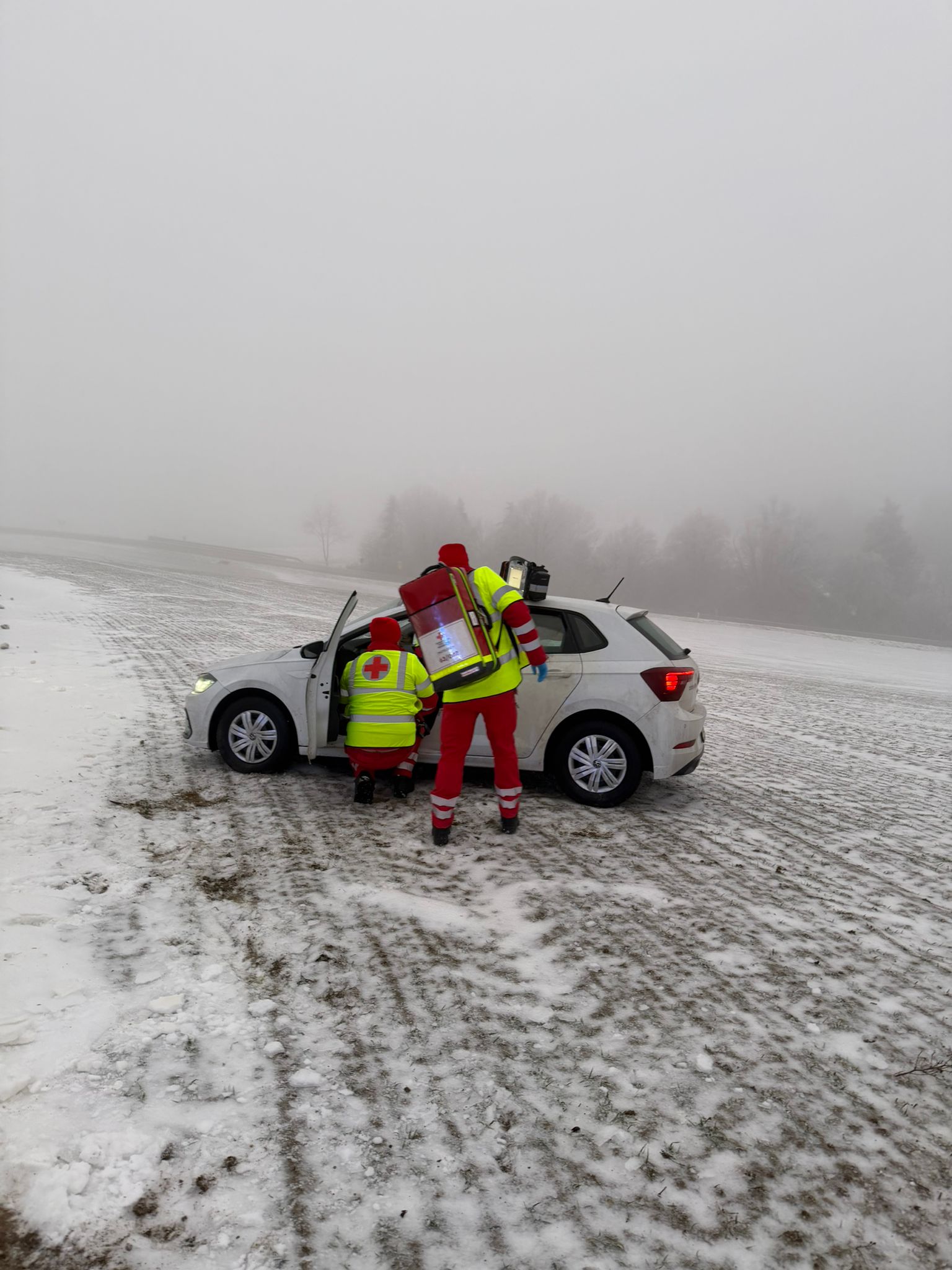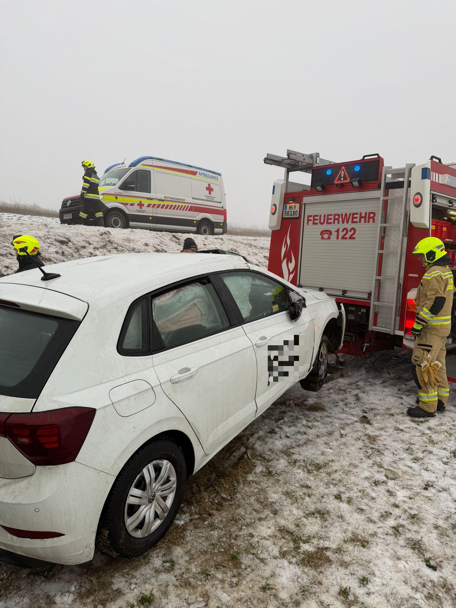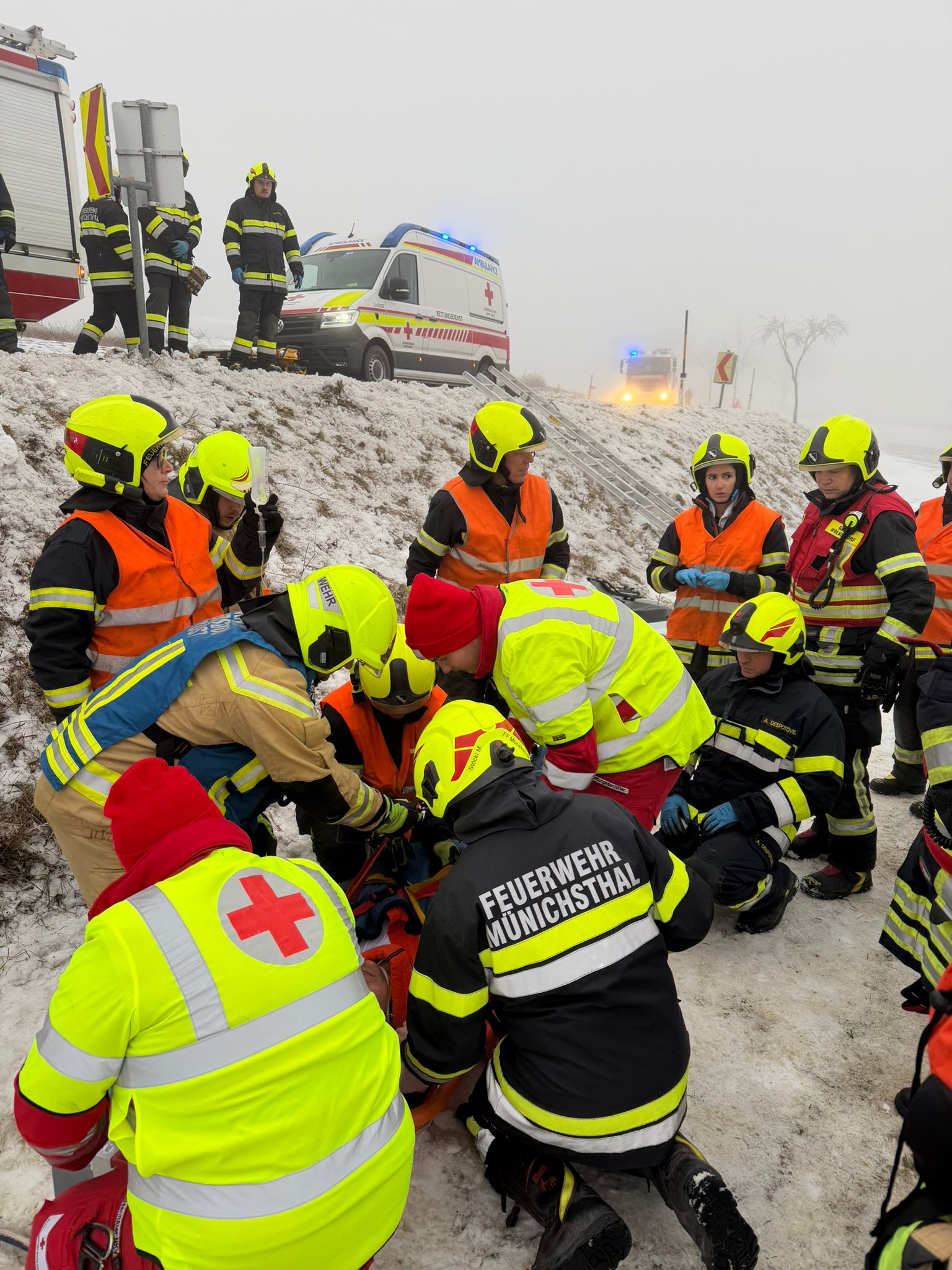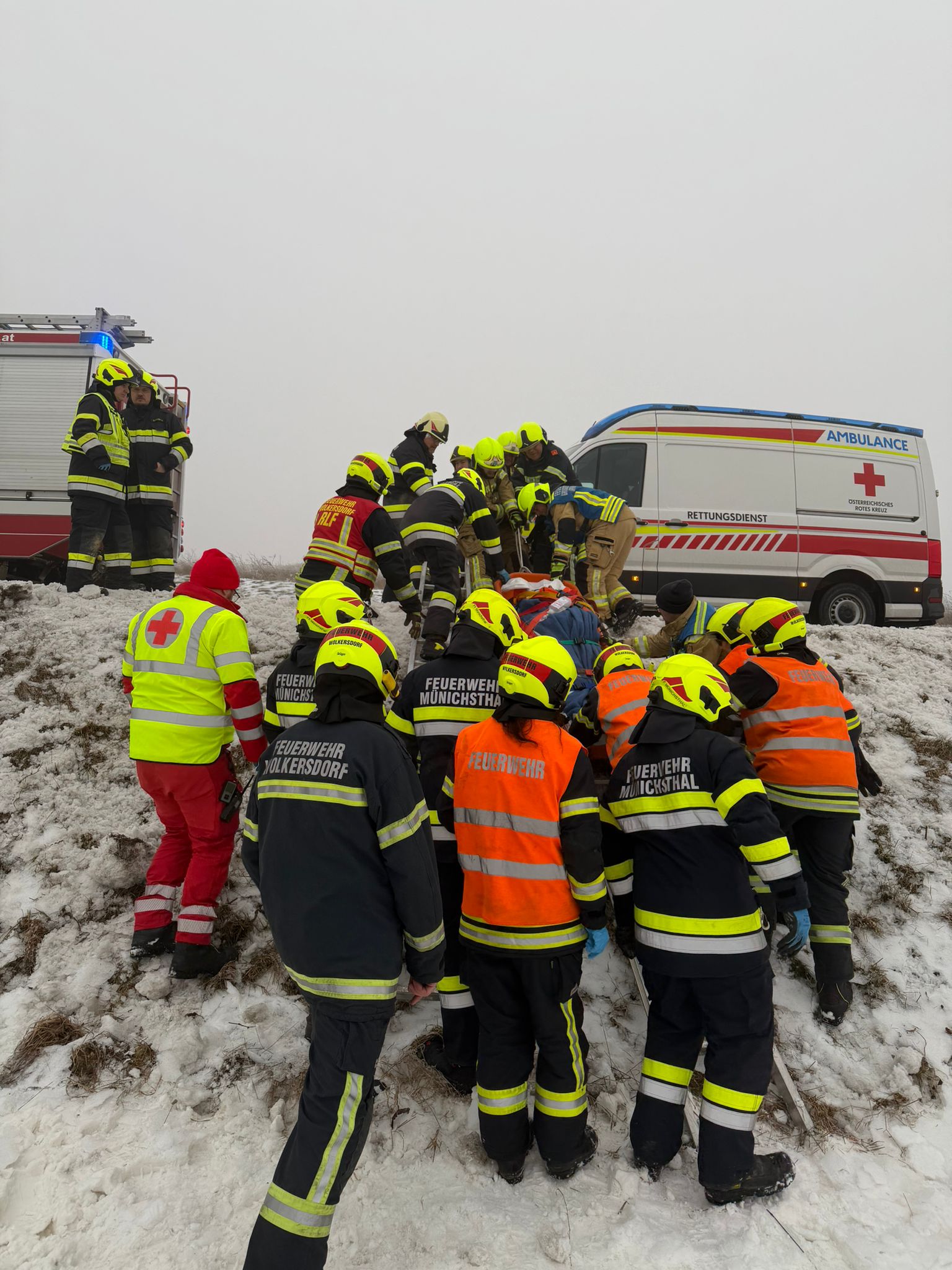 Beim Eintreffen wurde ein PKW vorgefunden, der aufgrund von Eisglätte von der Fahrbahn abgekommen war und sich überschlagen hatte. Die Fahrerin war unbestimmten Grades verletzt.